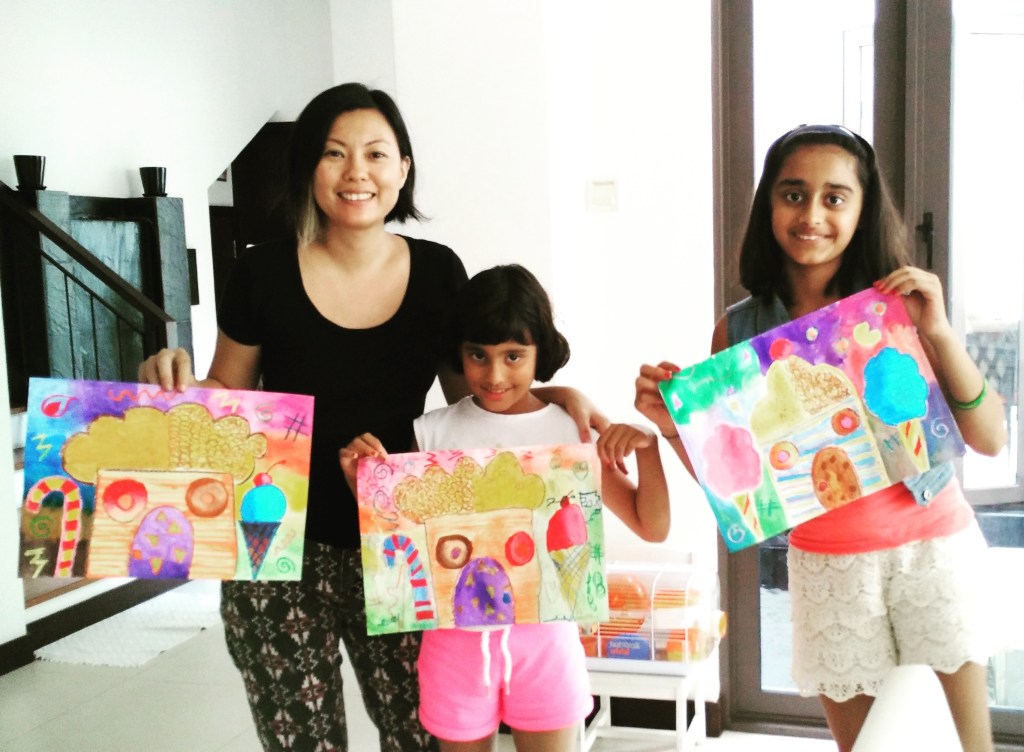 In our last lesson, 7 classes in total! Riona had learnt how to draw a human face, a human body, flowers, animals, building and today we created a Surrealist Drawing of a Candy House!