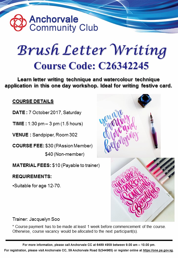 25 September – I will be conducting a Brush Lettering workshop with Anchorvale CC on 7th Oct, Sat, 130pm – 3pm.