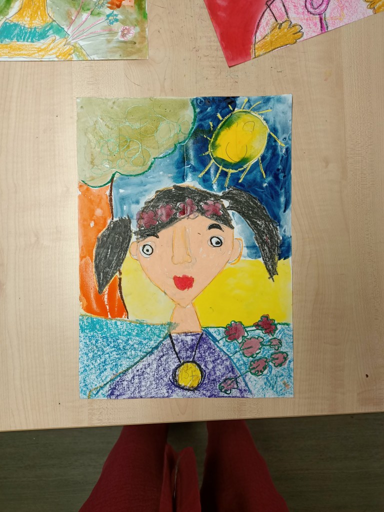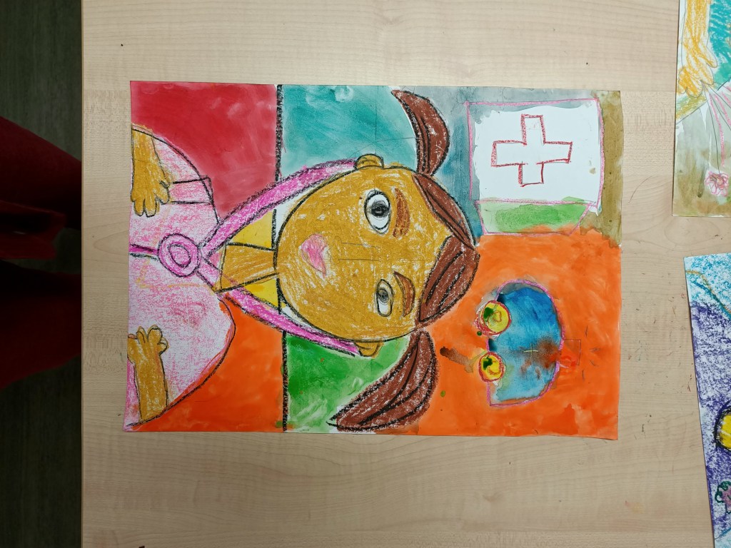 We had children who wanted to be gardeners, doctors, policeman, athletes and even a teacher like us! We used crayons and watercolour to complete the artwork!