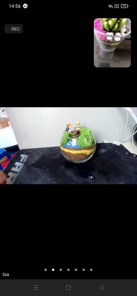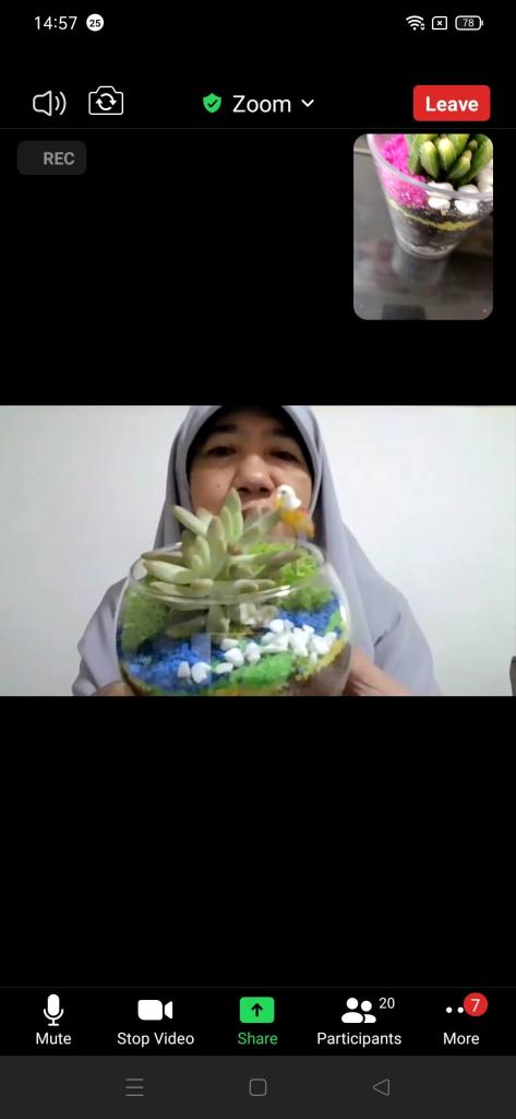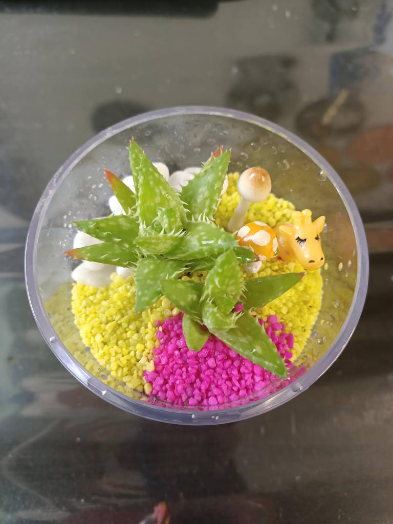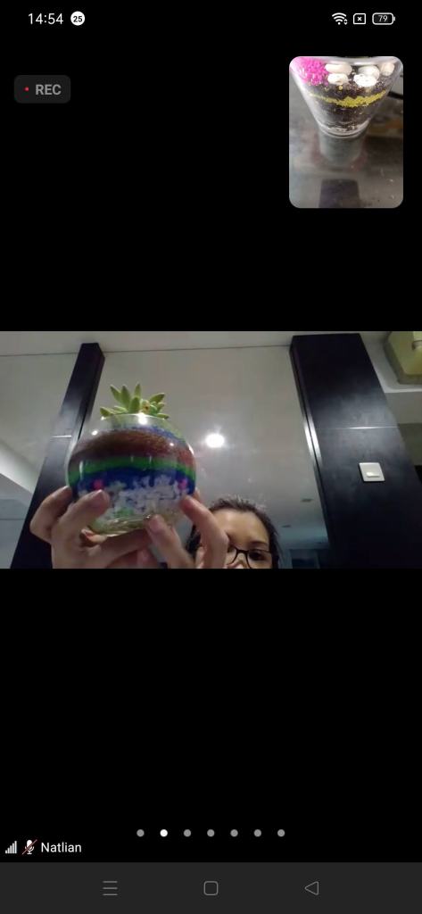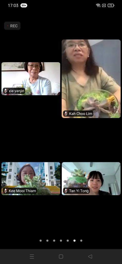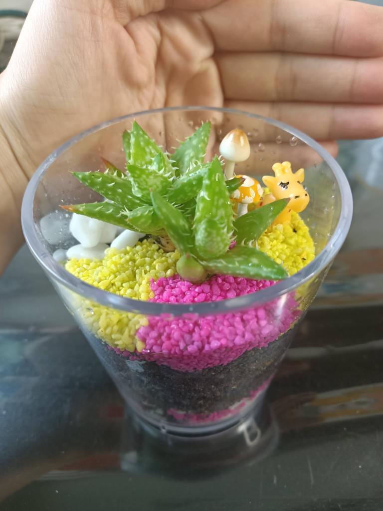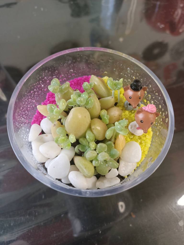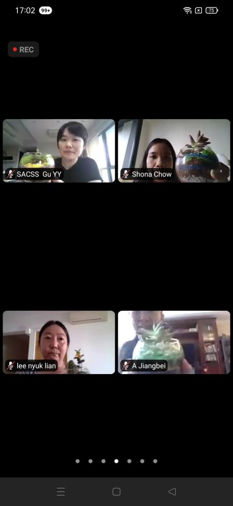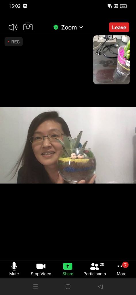 In the one hour session via zoom, I shared tips and tricks in assembling up a basic and simple open top terrarium and advised on watering methods and such. We decorated the open top terrarium with pebbles, fresh moss, coloured sand and toy figurine.
