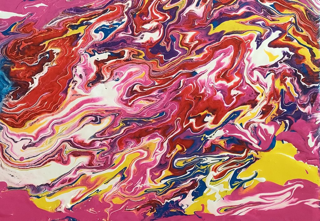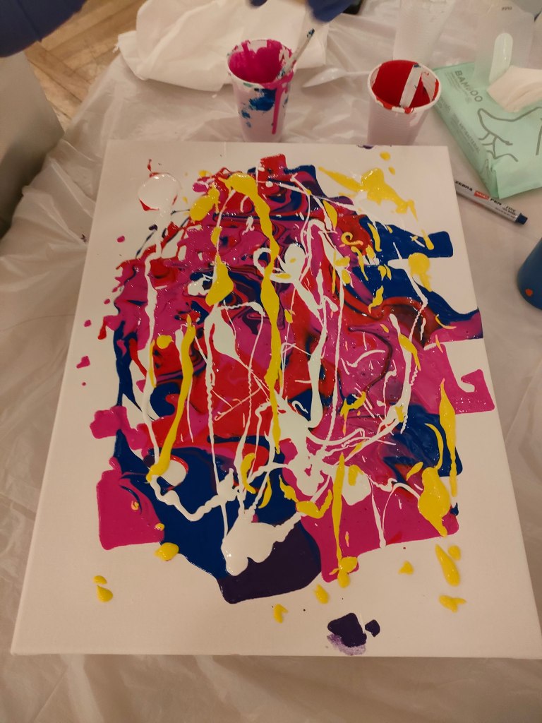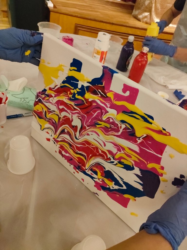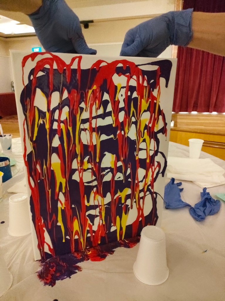 We started with the ever messy but enjoyable Acrylic Pour Painting and this time, several adults joined the class! Acrylic Pour Painting is an easy way to be introduced into the world of painting on canvas for new beginners.