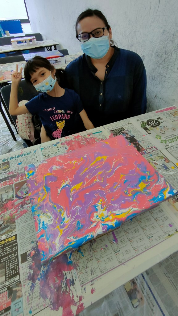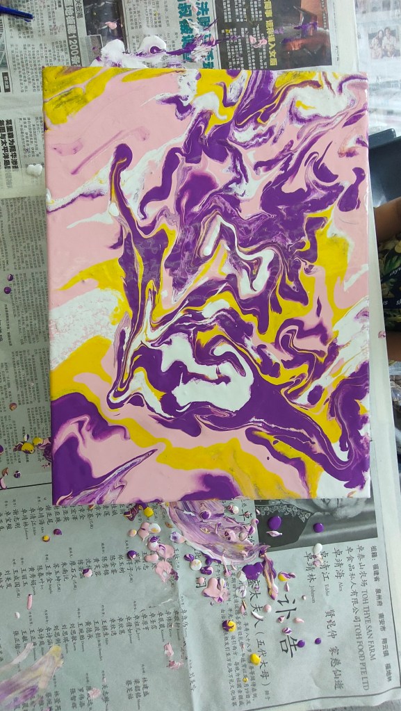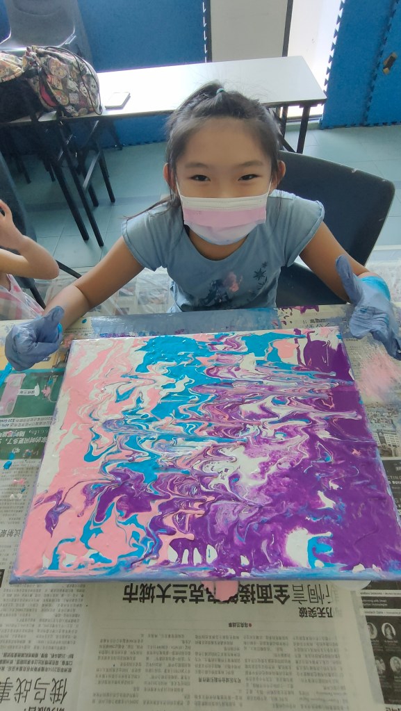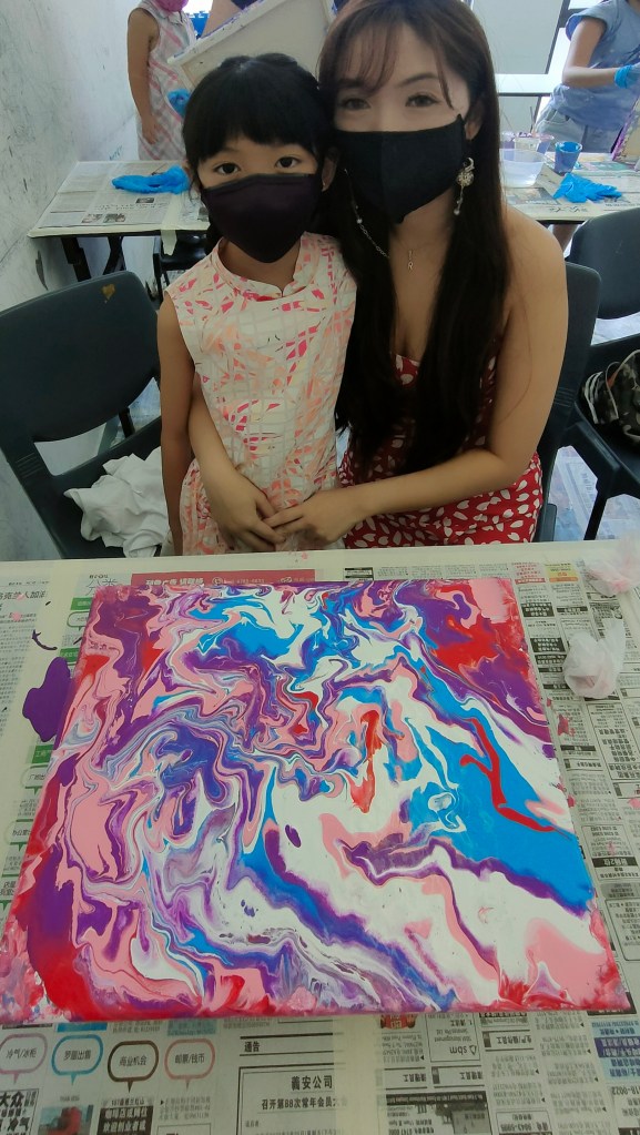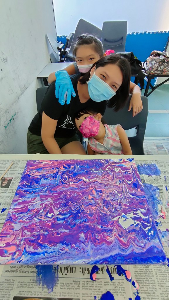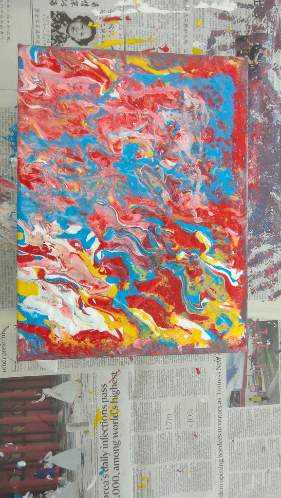 19 March 2022 – My acrylic pour painting is really popular with everyone! In June, I have more of these classes going on so you will see more pictures from me soon!