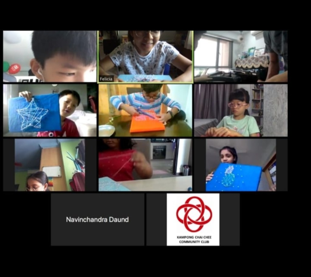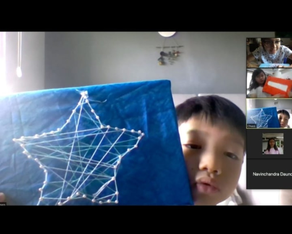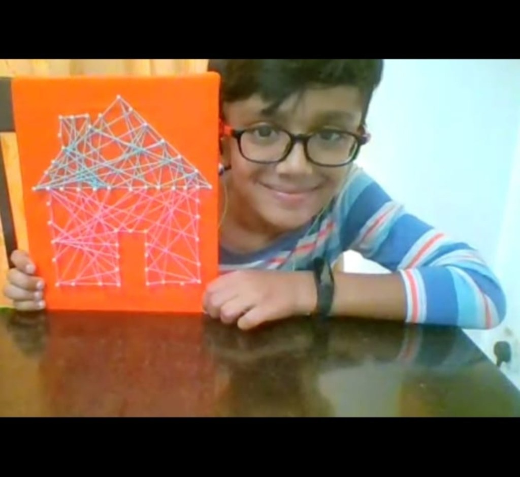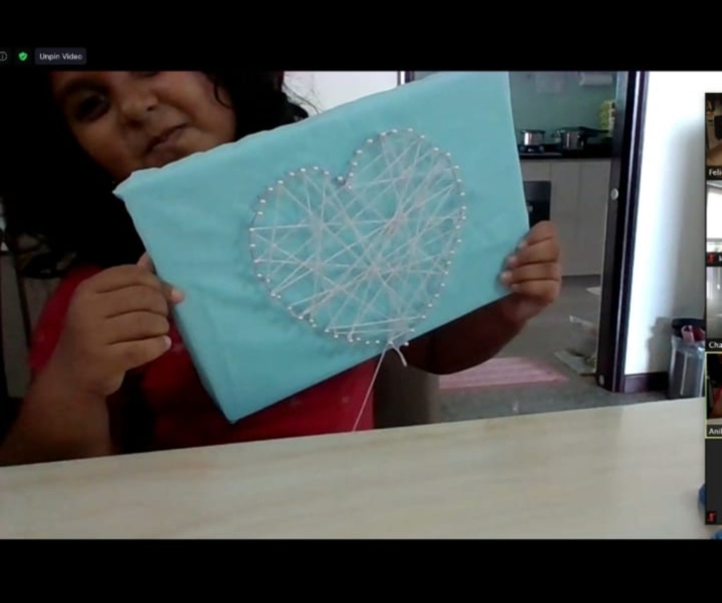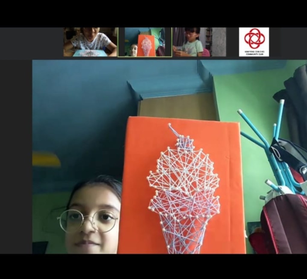 In this zoom session, our trainer Felicia Mak taught a group of young children how to do string art on foamboard using pins instead of wooden boards with hammers & nails! Safety first for all!