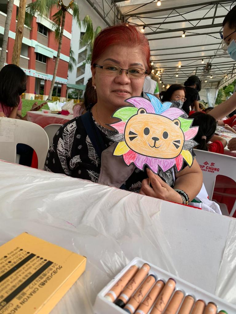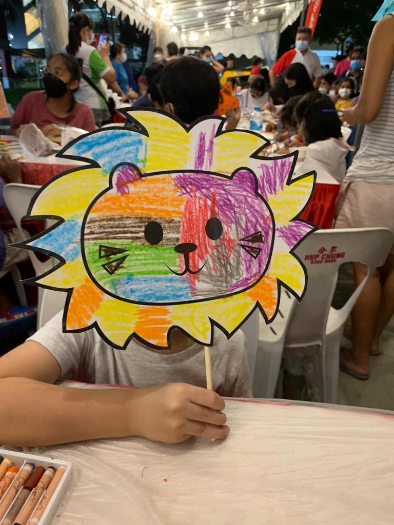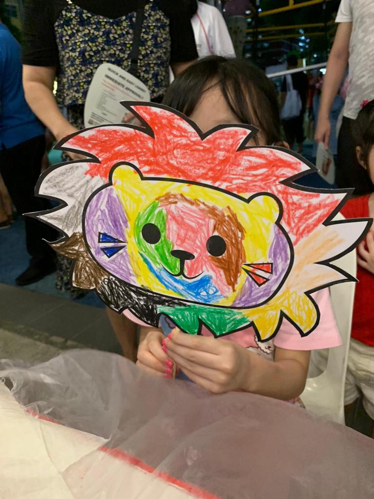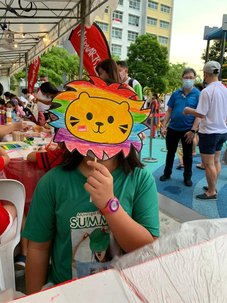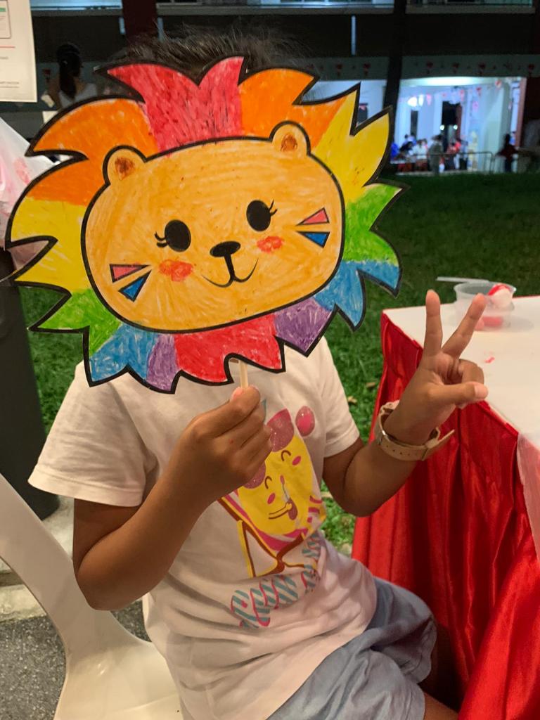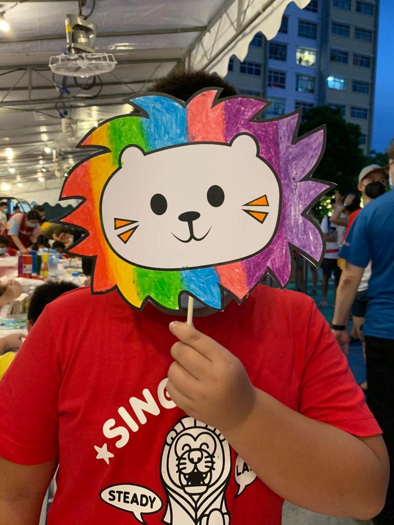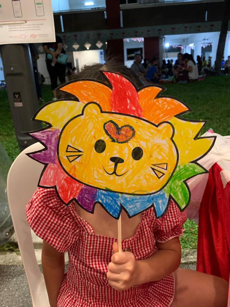Residents of the area created and took home a Lion Mask, a Painted Totebag, a Cloth Peg Butterfly/Airplane Clip and left a splash of colour on the wooden board for a fun and colourful time! What a National Day happening that was!