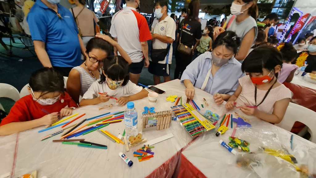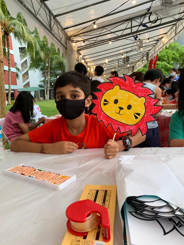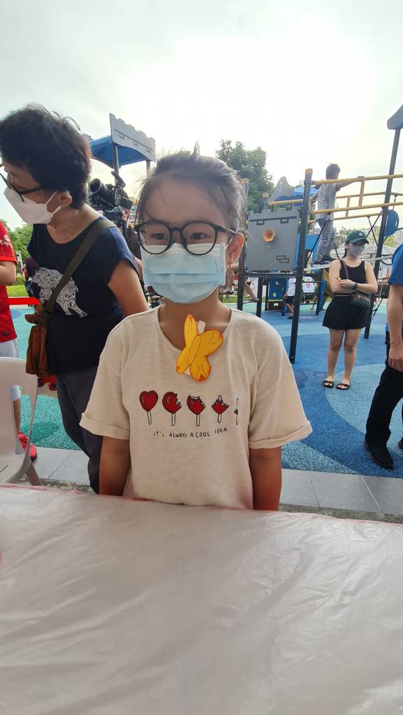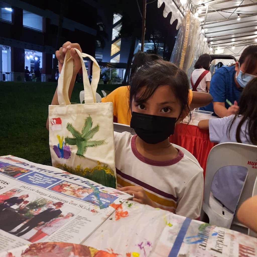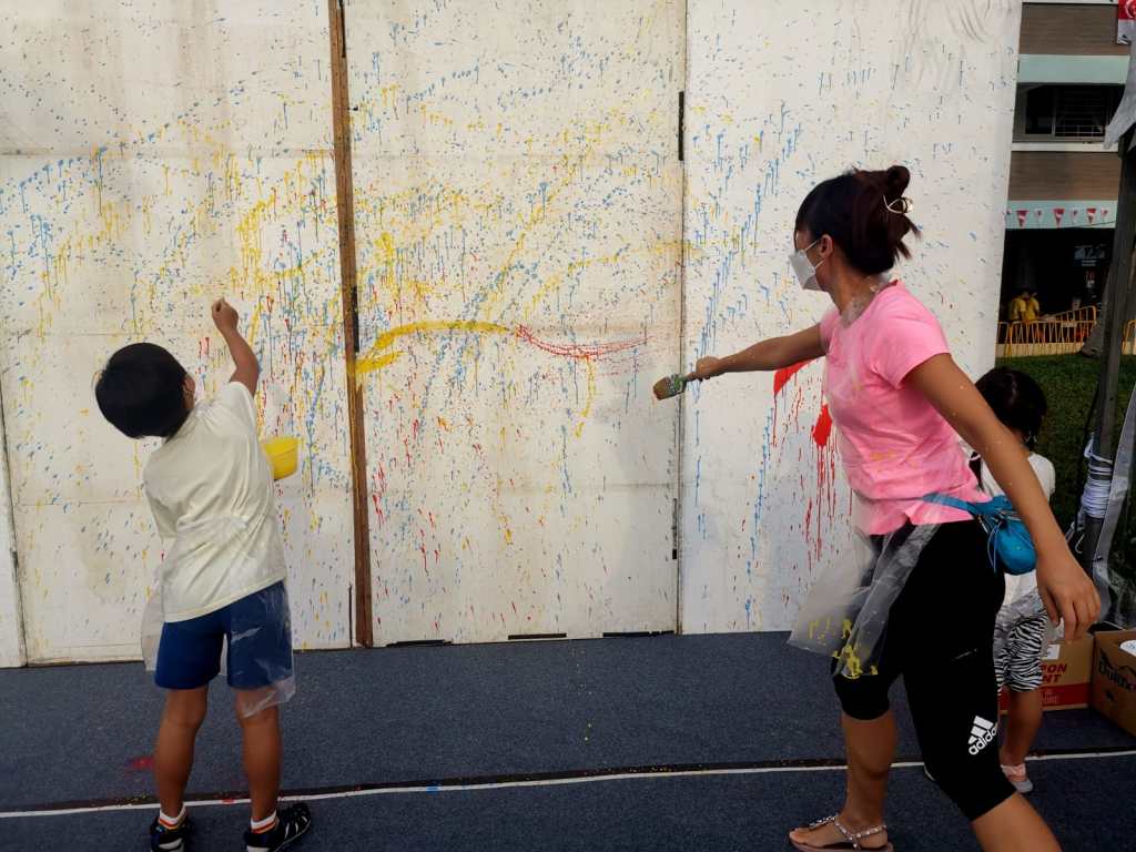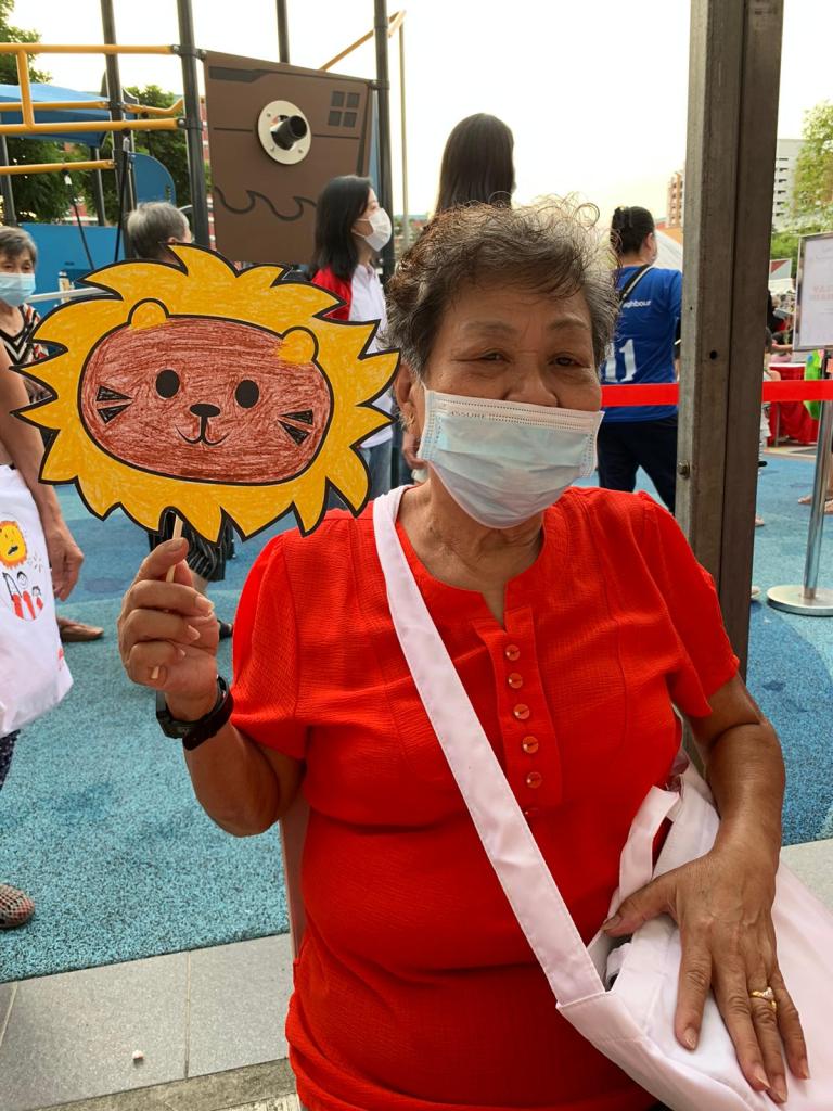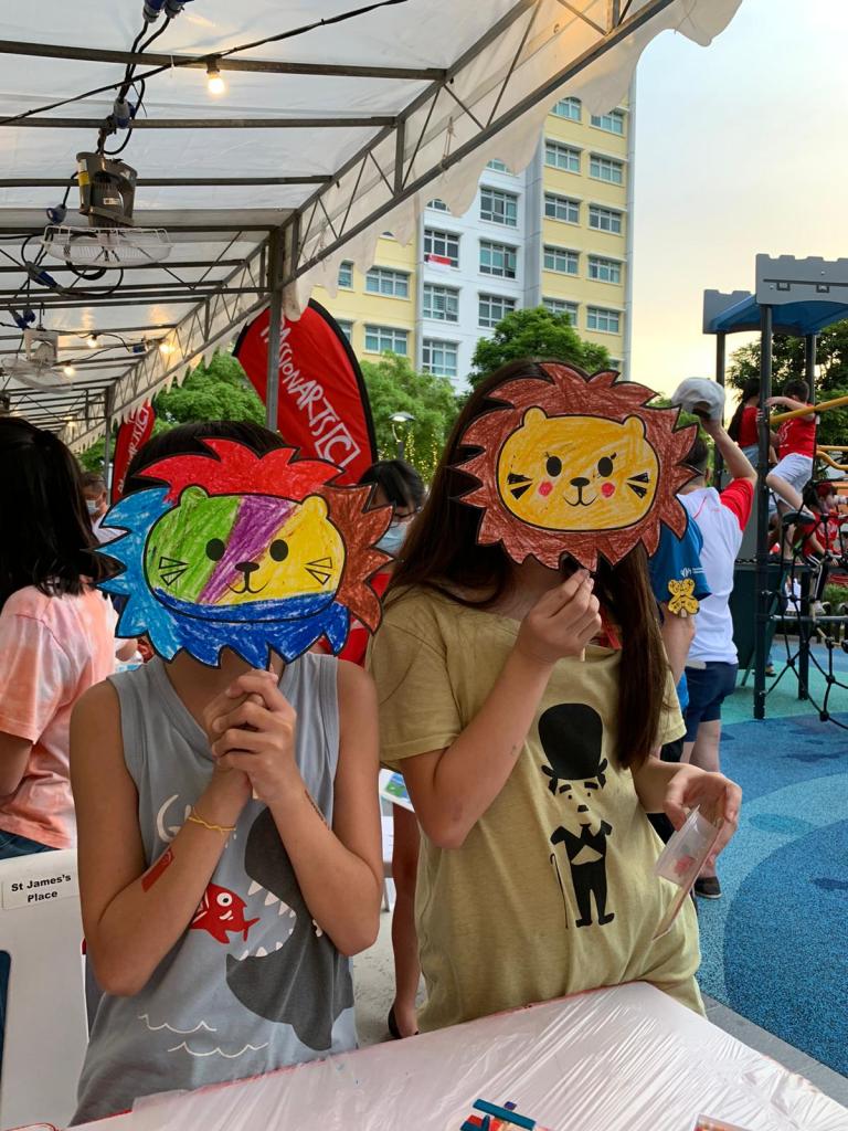 Residents of the area created and took home a Lion Mask, a Painted Totebag, a Cloth Peg Butterfly/Airplane Clip and left a splash of colour on the wooden board for a fun and colourful time! What a National Day happening that was!