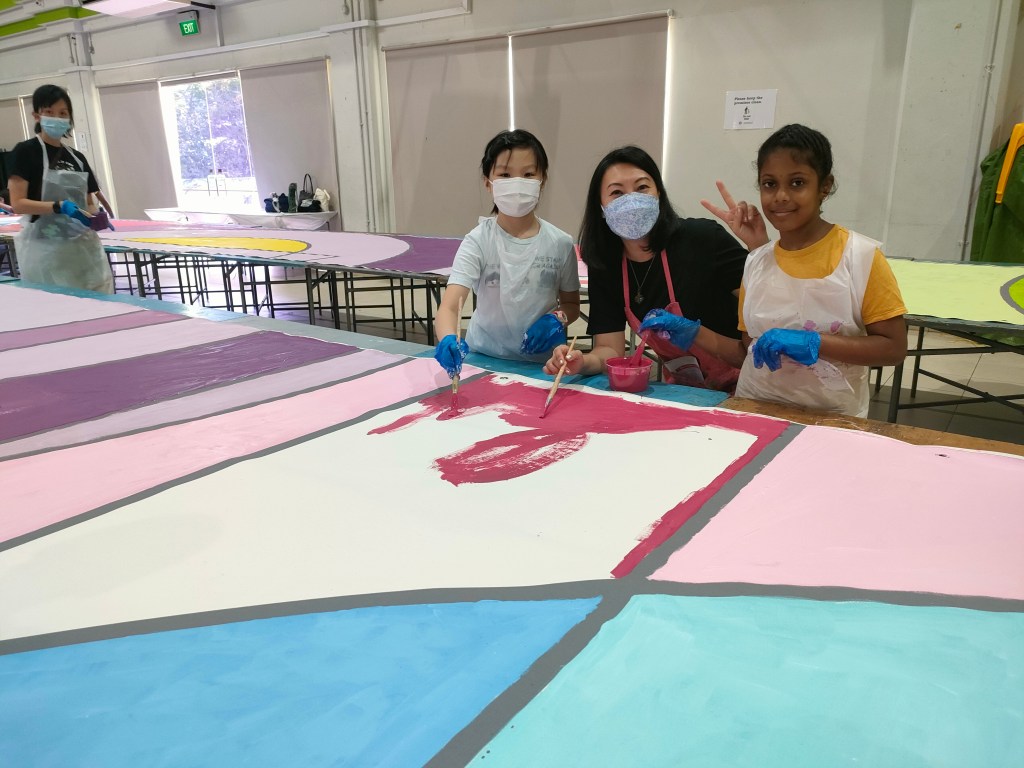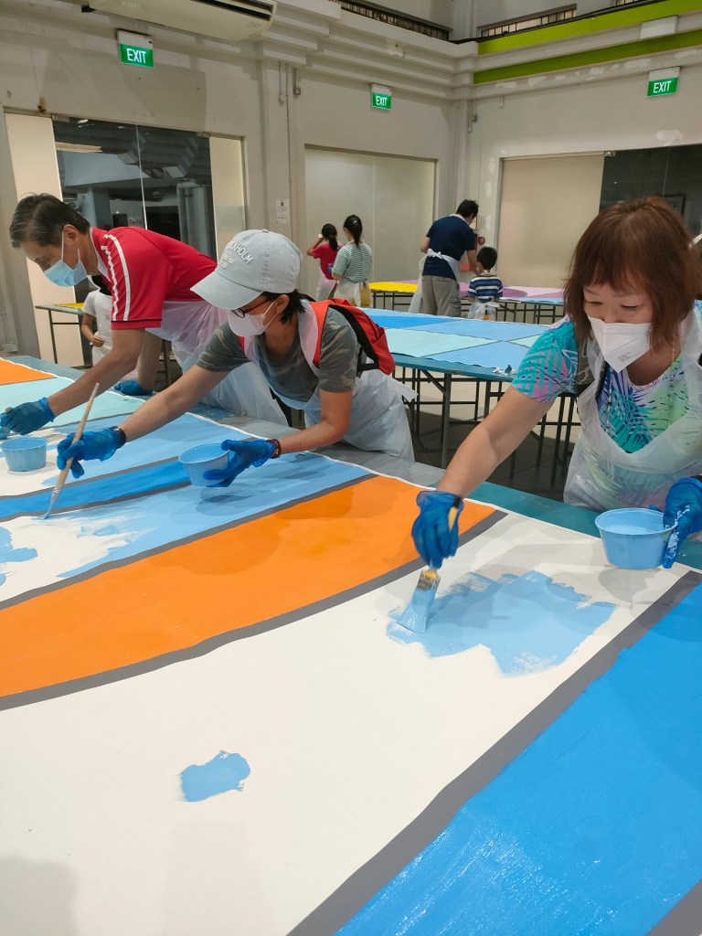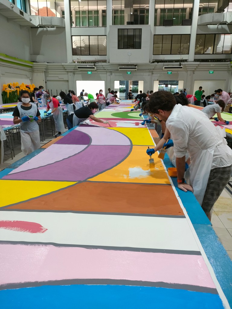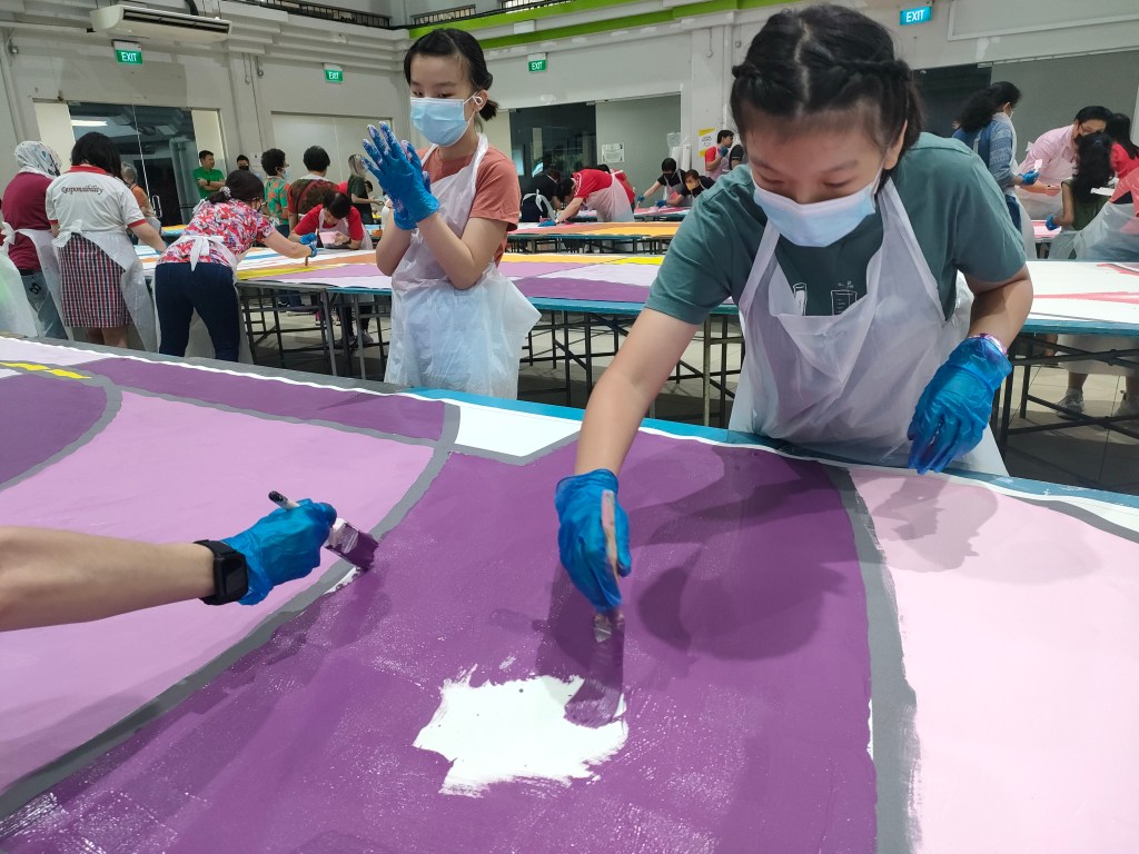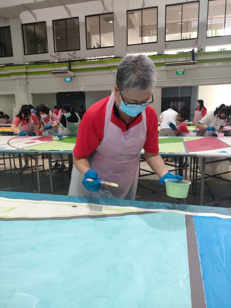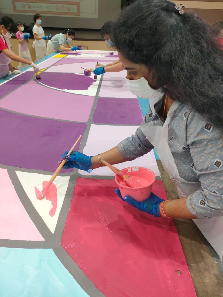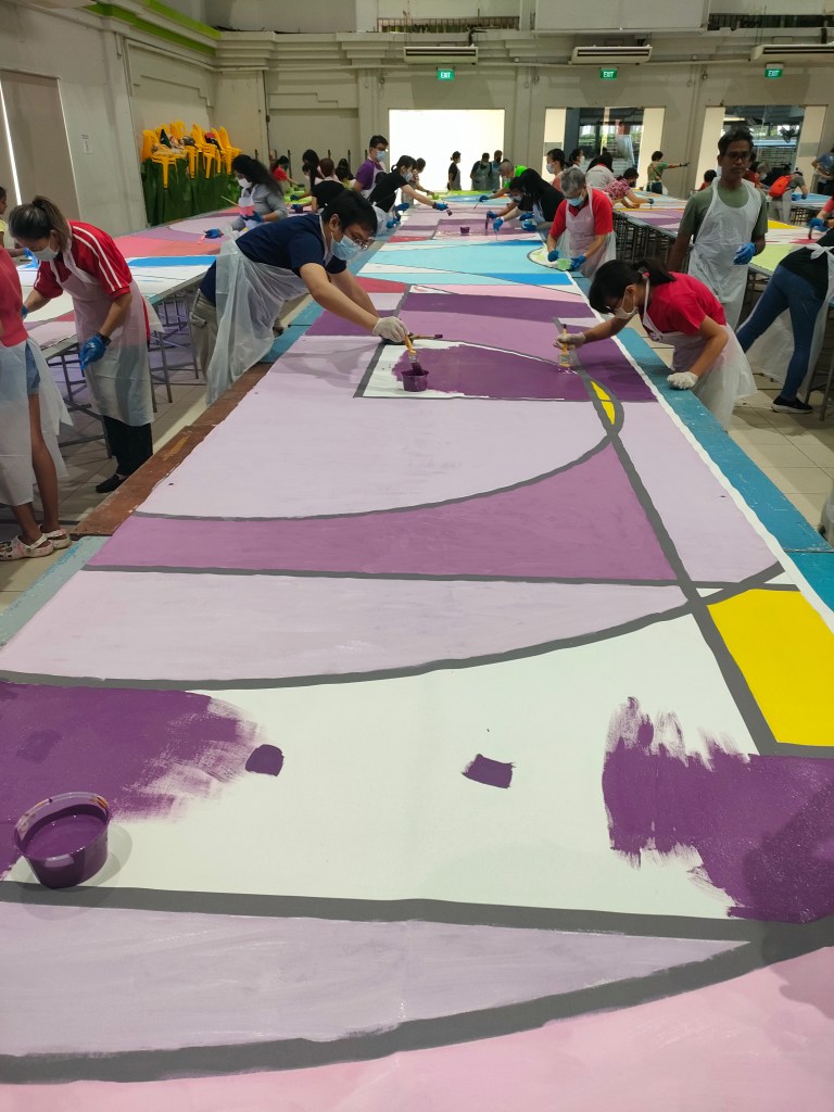We had chosen a simple geometric design, one that showed diversity and harmony in lines and colours to represent the community. It was a two-day event of busy painting, coordinating, and touching up of ten pieces of 10metres long PVC banners! It was o easy feat but we completed it with grace and pride!