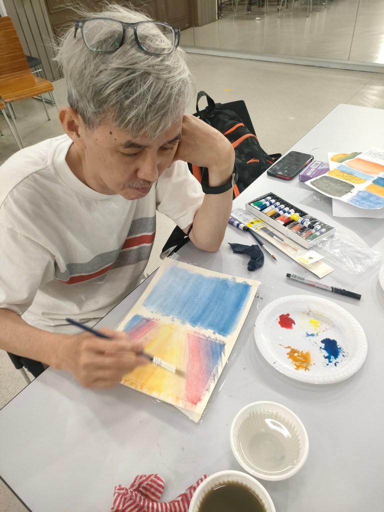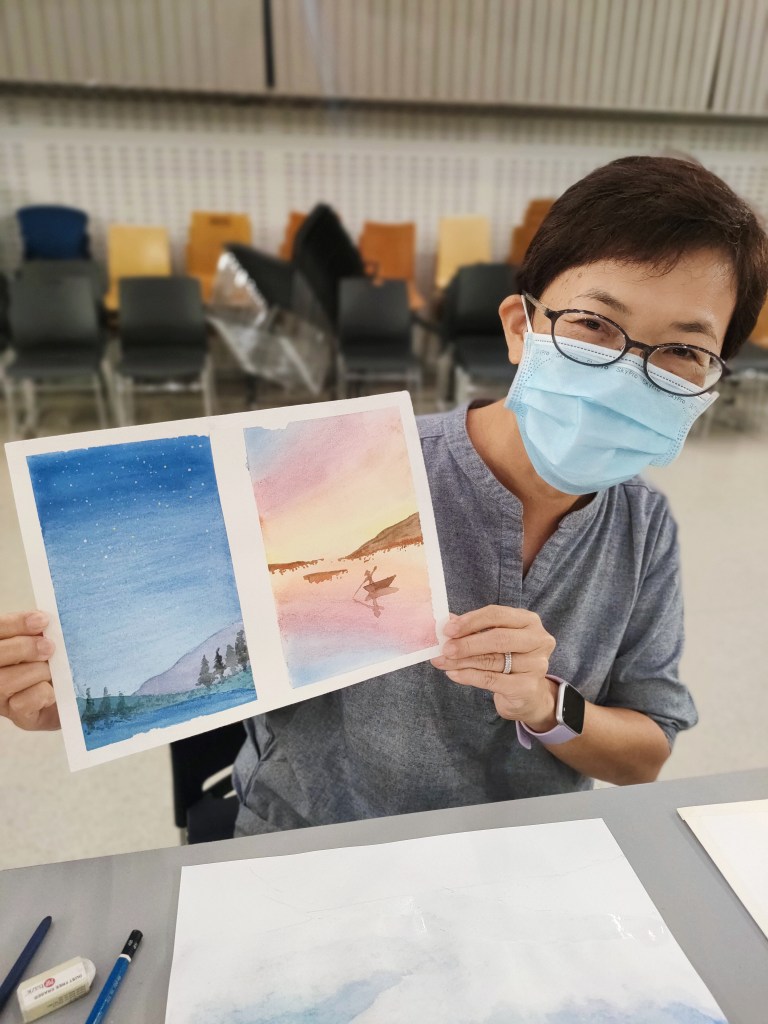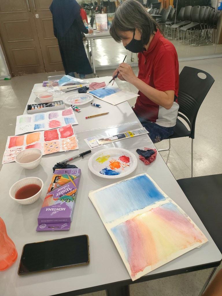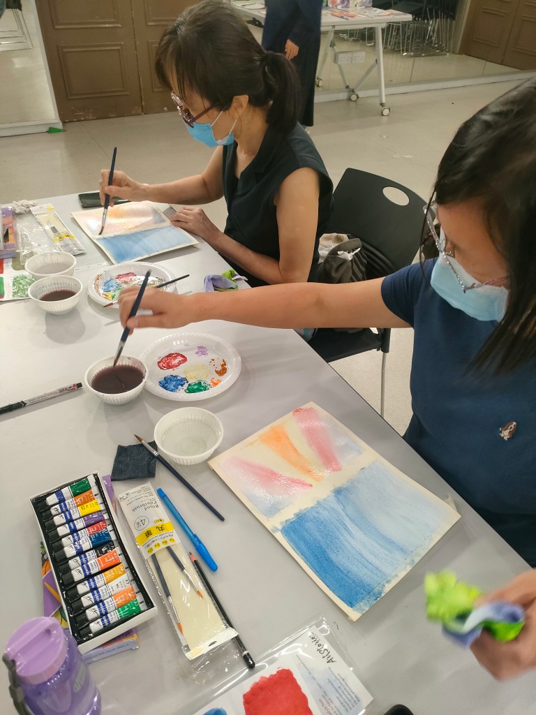 I taught them the basic of watercolour painting; Wet on Wet, Wet on Dry, Dry on Dry, Layering, Blending and also introduced more modern techniques such as Salt Splatter, Plastic Film Wrap Blocking, and Alcohol Dripping etc.