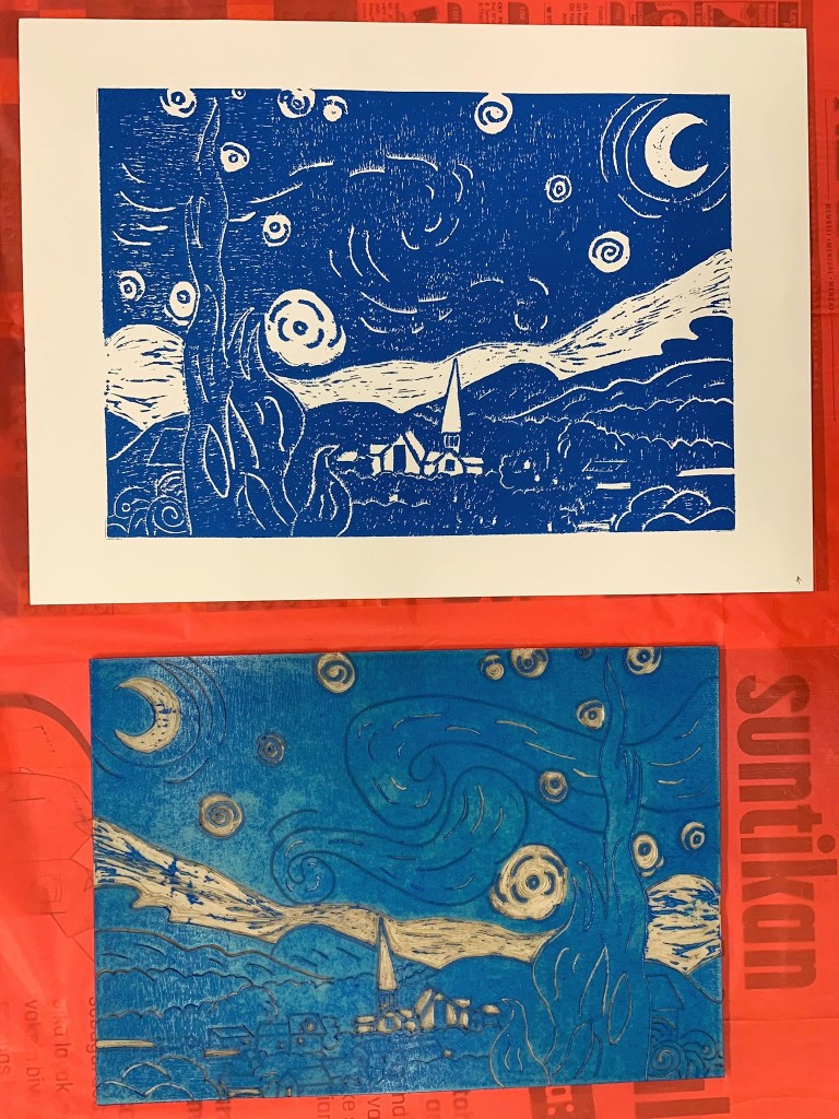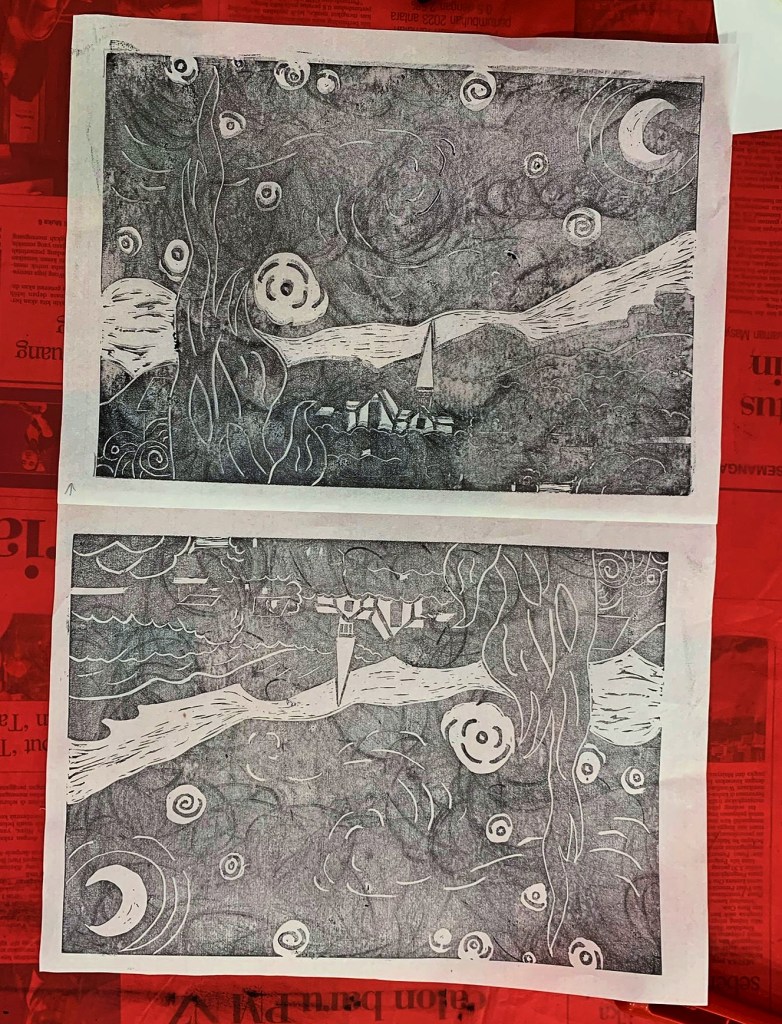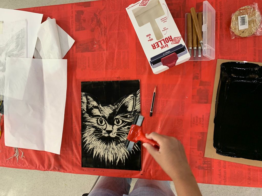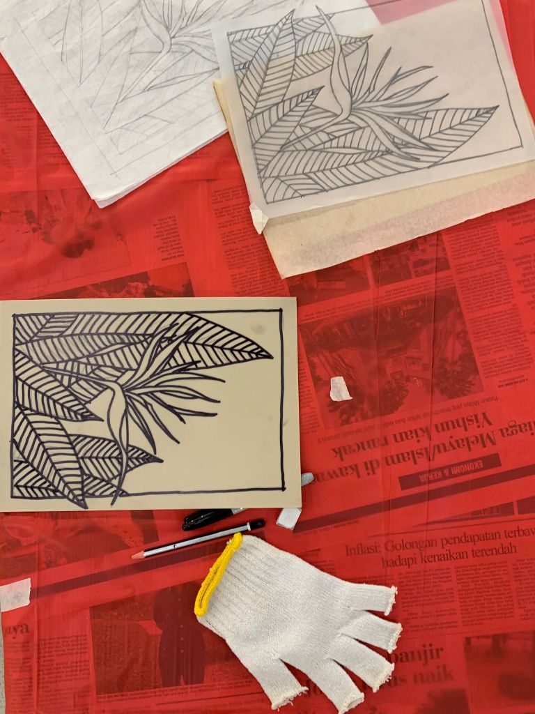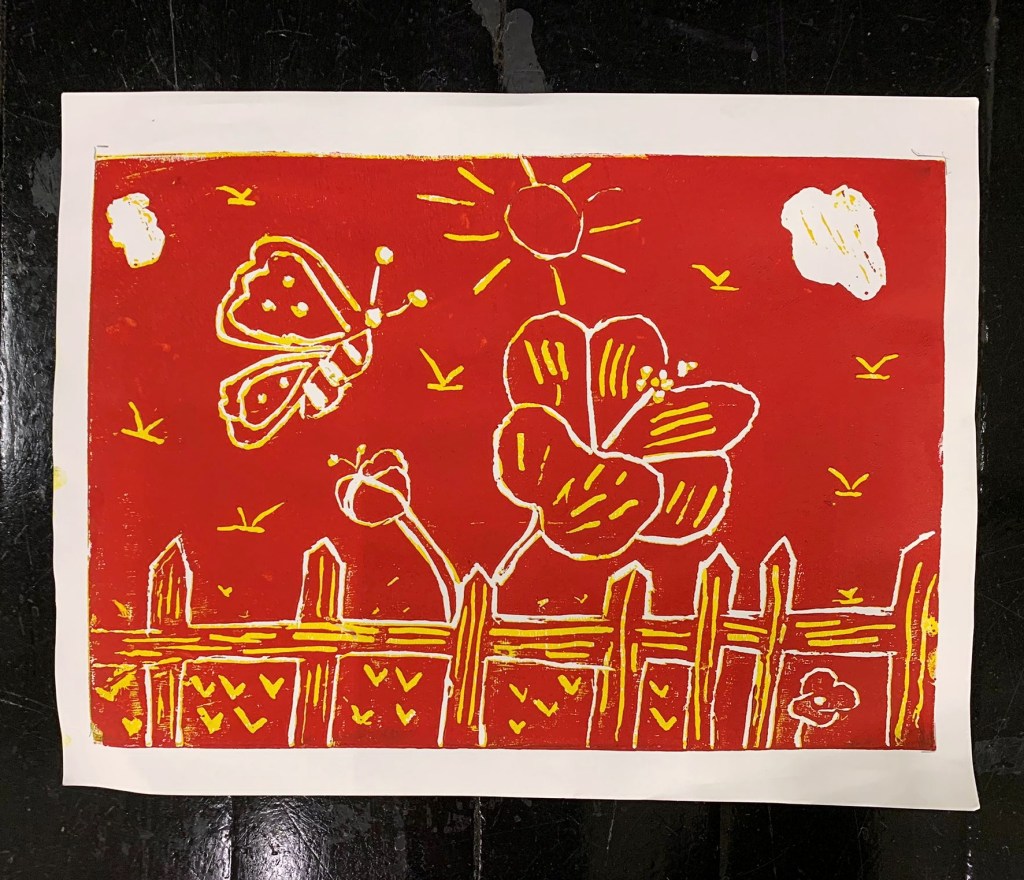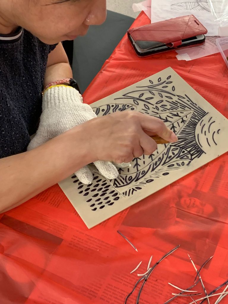 The Seniors started with their sketch on paper which was later transferred to the Linopad and then they could carve out using the cutting tools. After carving 1st layer, we applied 1 layer of colour first before moving onto the next colour.