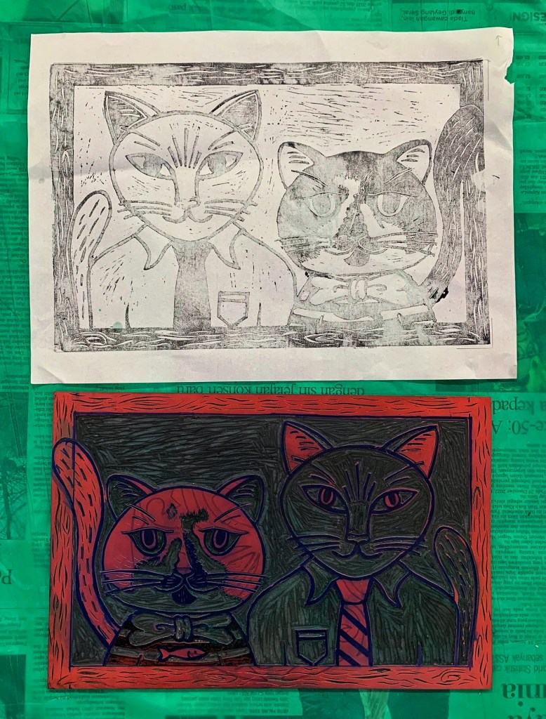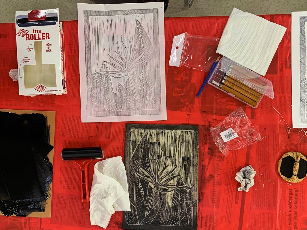The Printmaking technique which I taught them was then Basic Linography Cut on Rubber Pads. It still requires carving/cutting tools, brayers and barens, coloured inks and a base for putting the inks on etc. In this case, we used acrylic sheets.