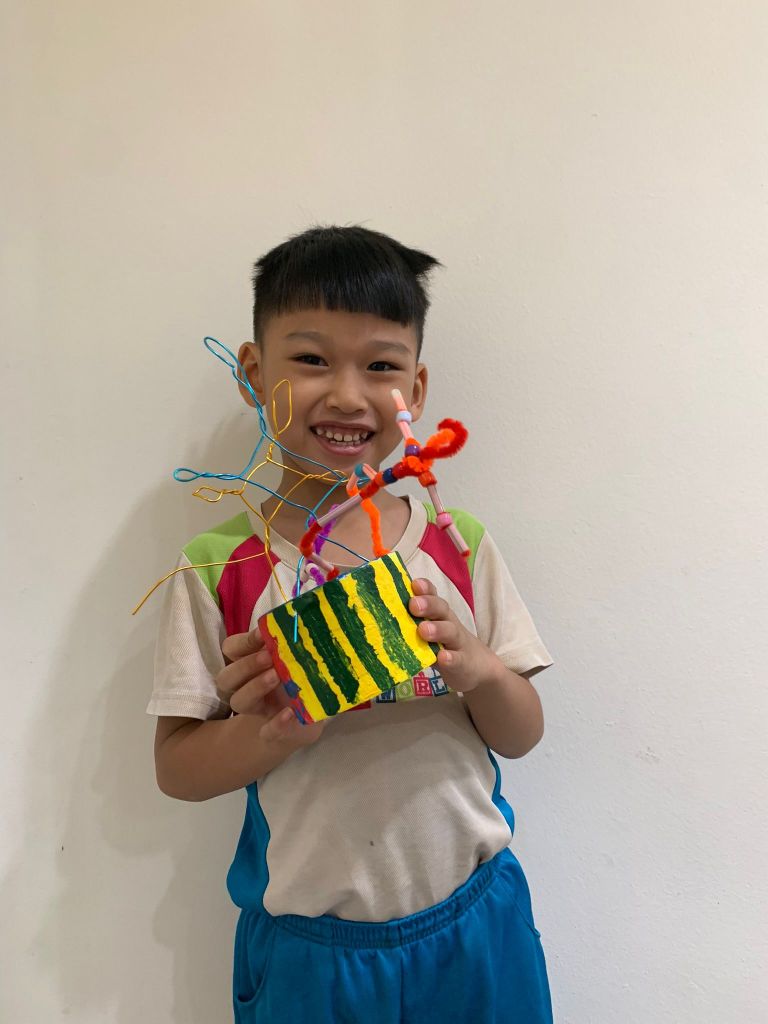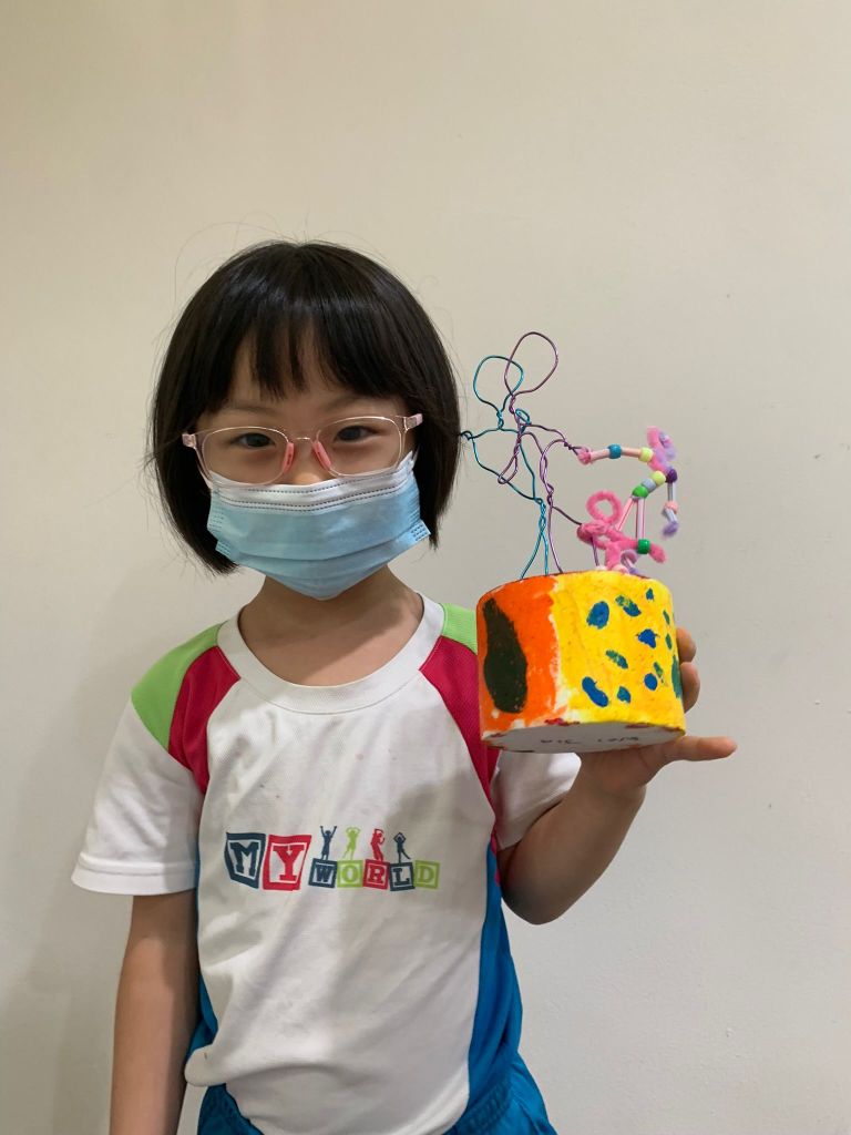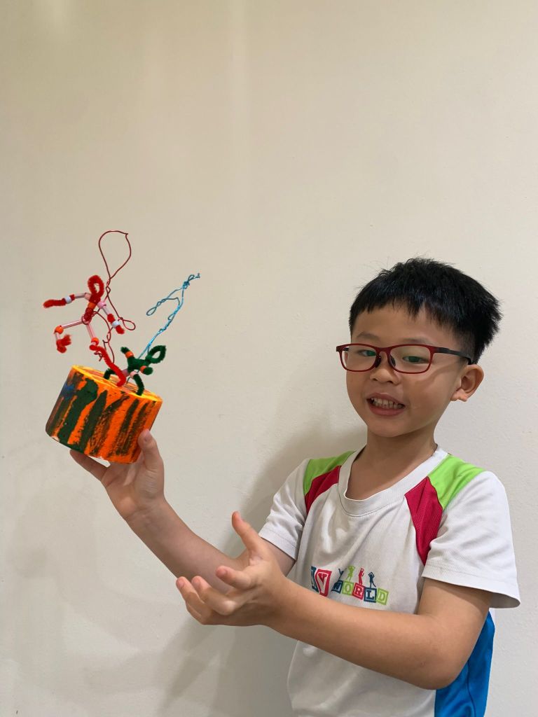 We always have fun singing and dancing in each lesson before we start painting and creating our little wire human figurines. The children learnt about our human body and the bones that hold our muscle and skin up!
