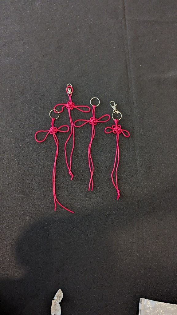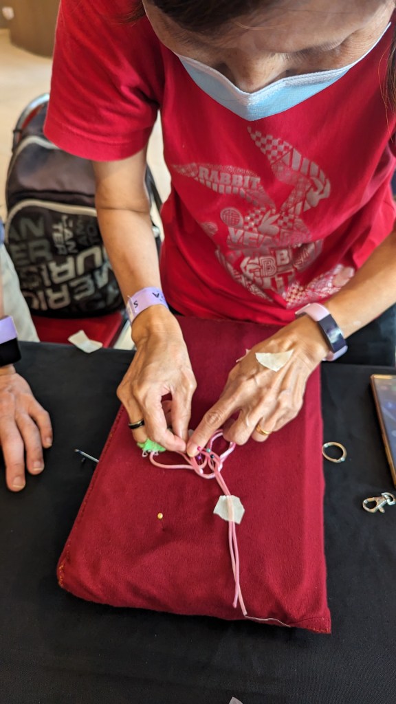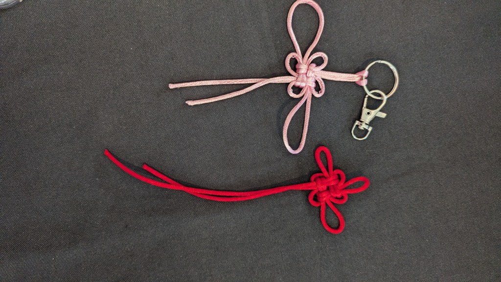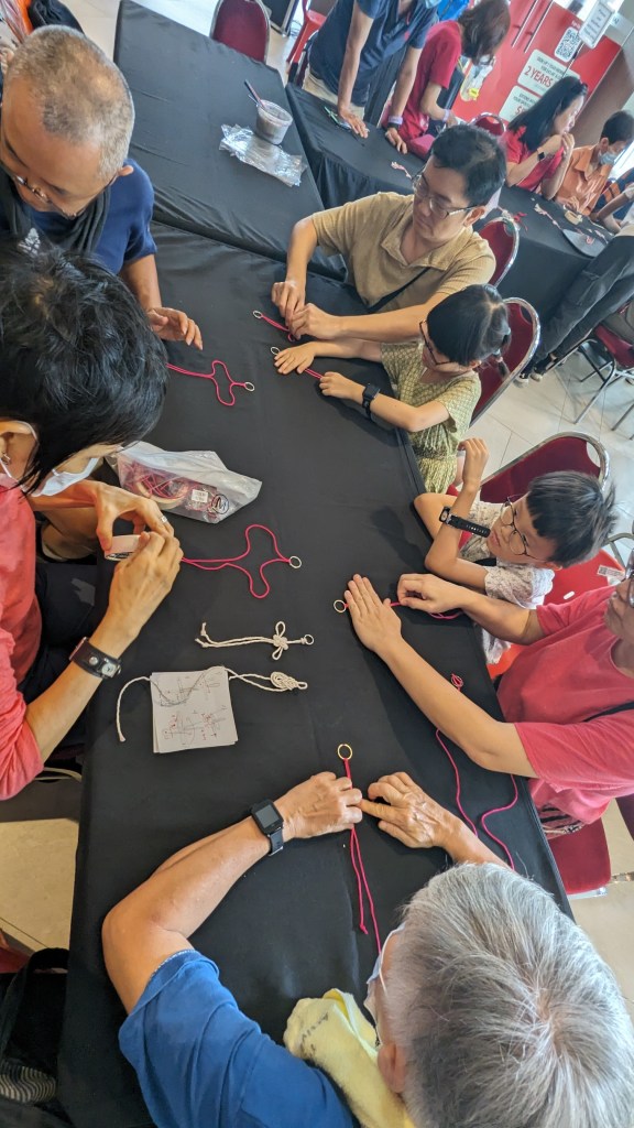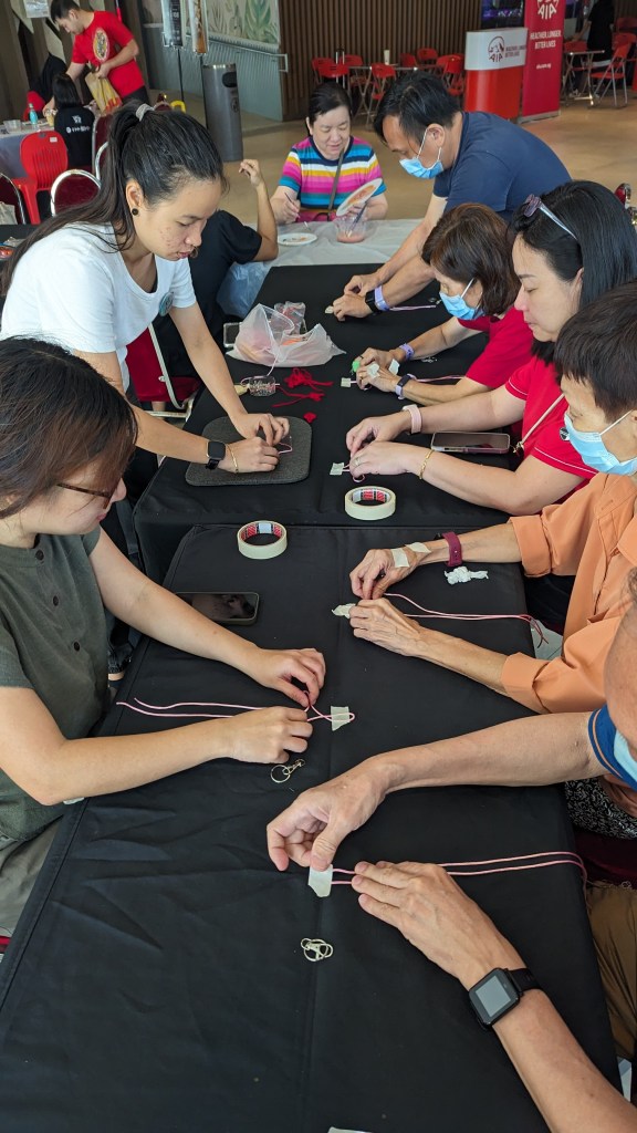 On another table, they learnt how to tie the fortune knot using red/orange/pink cords and tie it to become a key-chain that they can use as well! Both functional and relatable to the festival celebration!