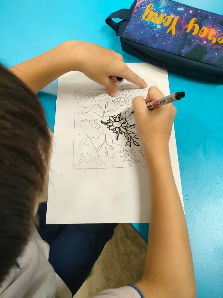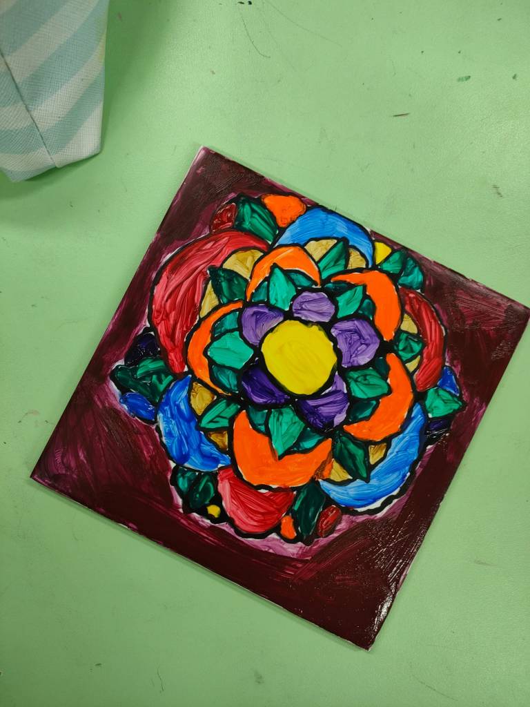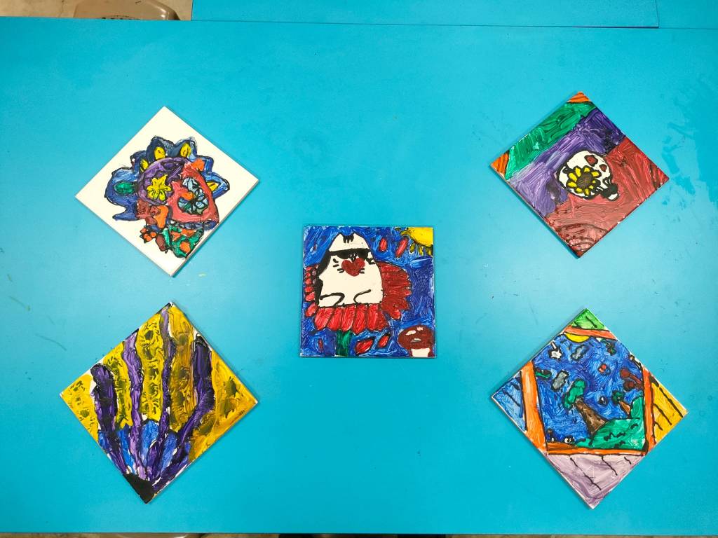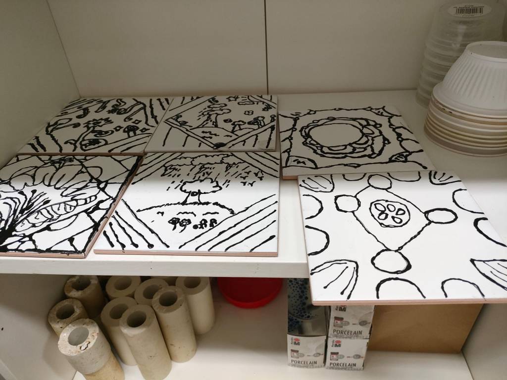 The completed works are on 15cm x 15cm ceramic tiles, hand painted using acrylic paints and black paste paints for the outline work. The school may decide to display the pieces on their walls.