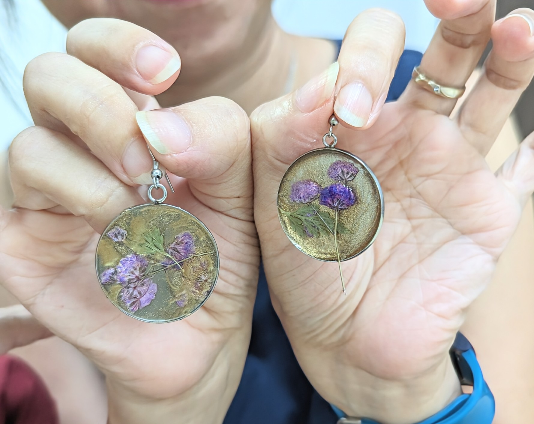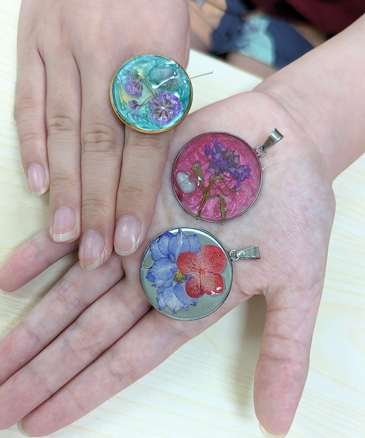 In the bath bomb session, families create colorful, fragrant bath bombs to take home, while the brush lettering workshop teaches elegant writing techniques for personalized designs. In the resin jewelry workshop, families make unique, custom jewelry pieces by adding decorative elements to resin molds.