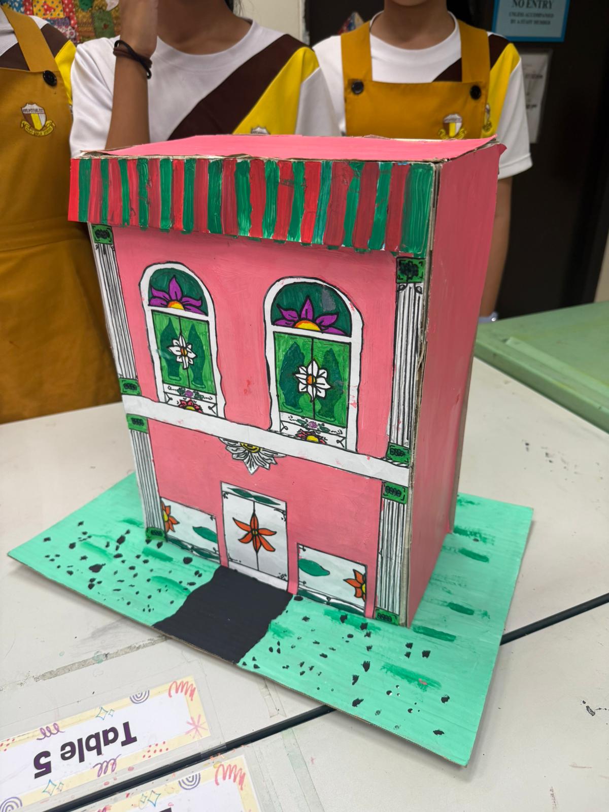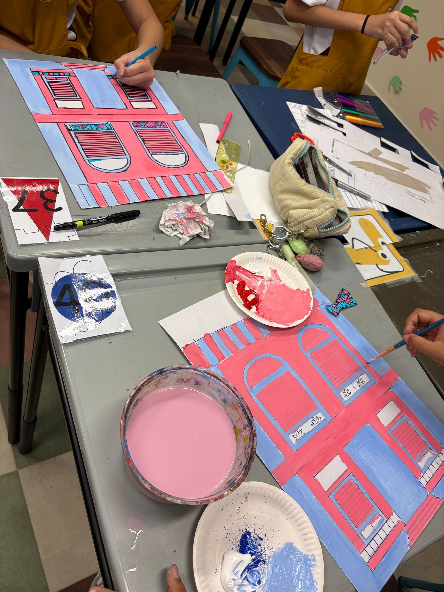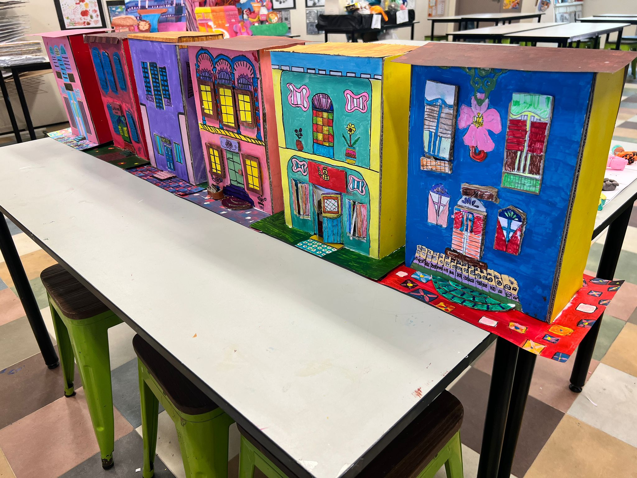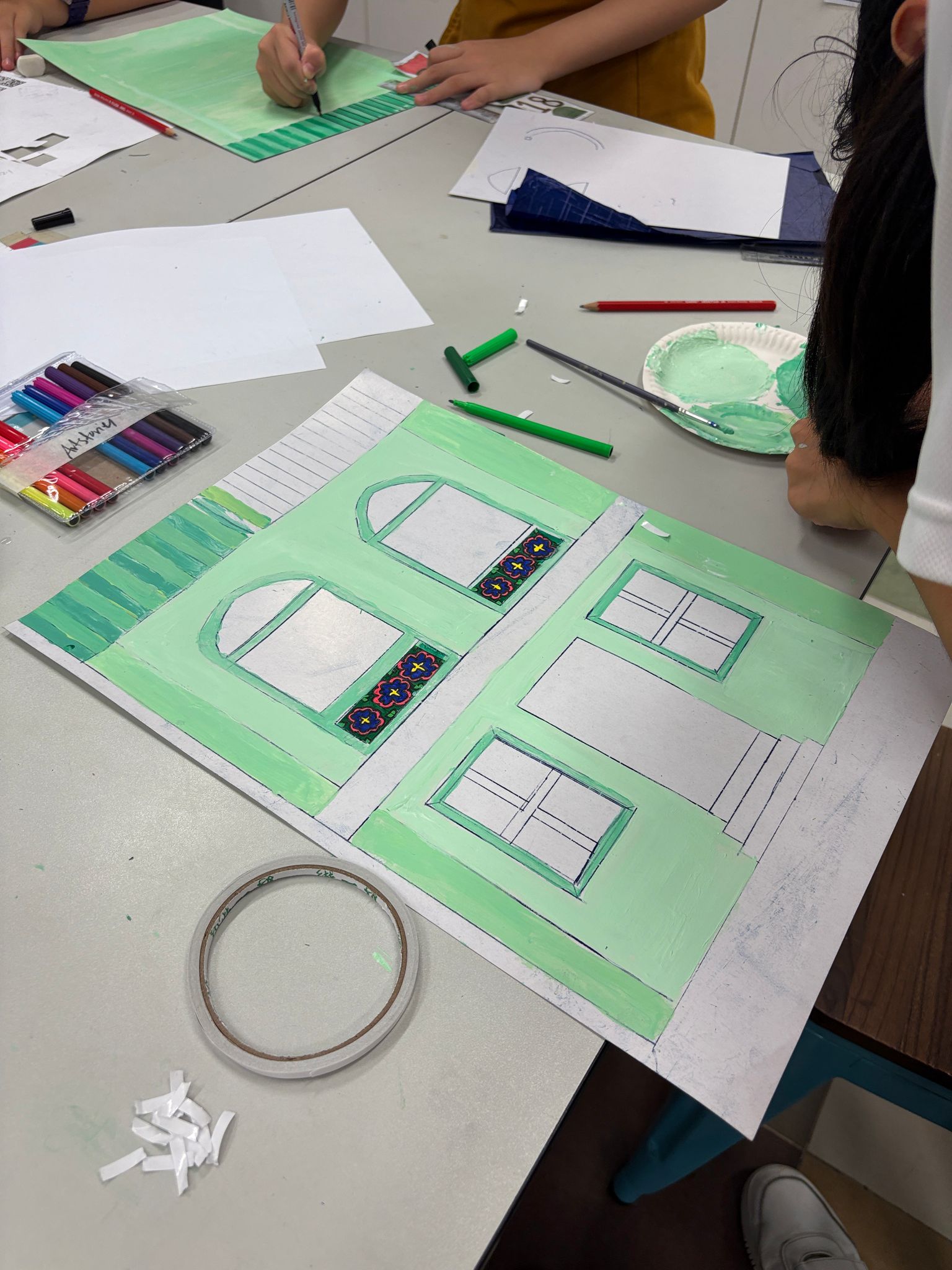 We did a collage-making project with Haig Girls, honoring the Peranakan Houses in Singapore! Through this hands-on activity, the students explored the unique architectural features and cultural significance of these iconic shophouses. Using only cardboard pieces, glue, tape, styrofoam, paints, and papers, the students created their version and understanding of Peranakan Houses.