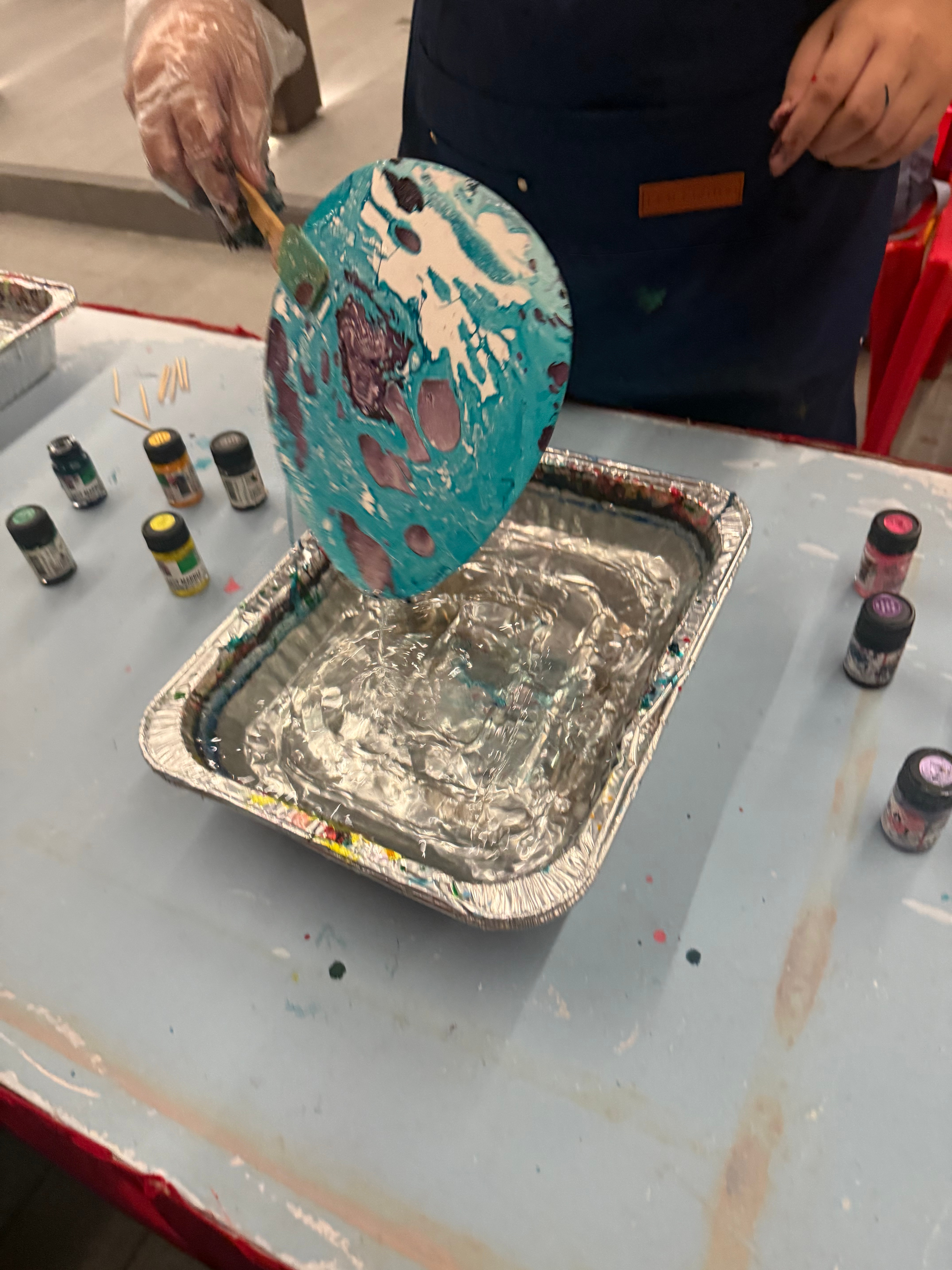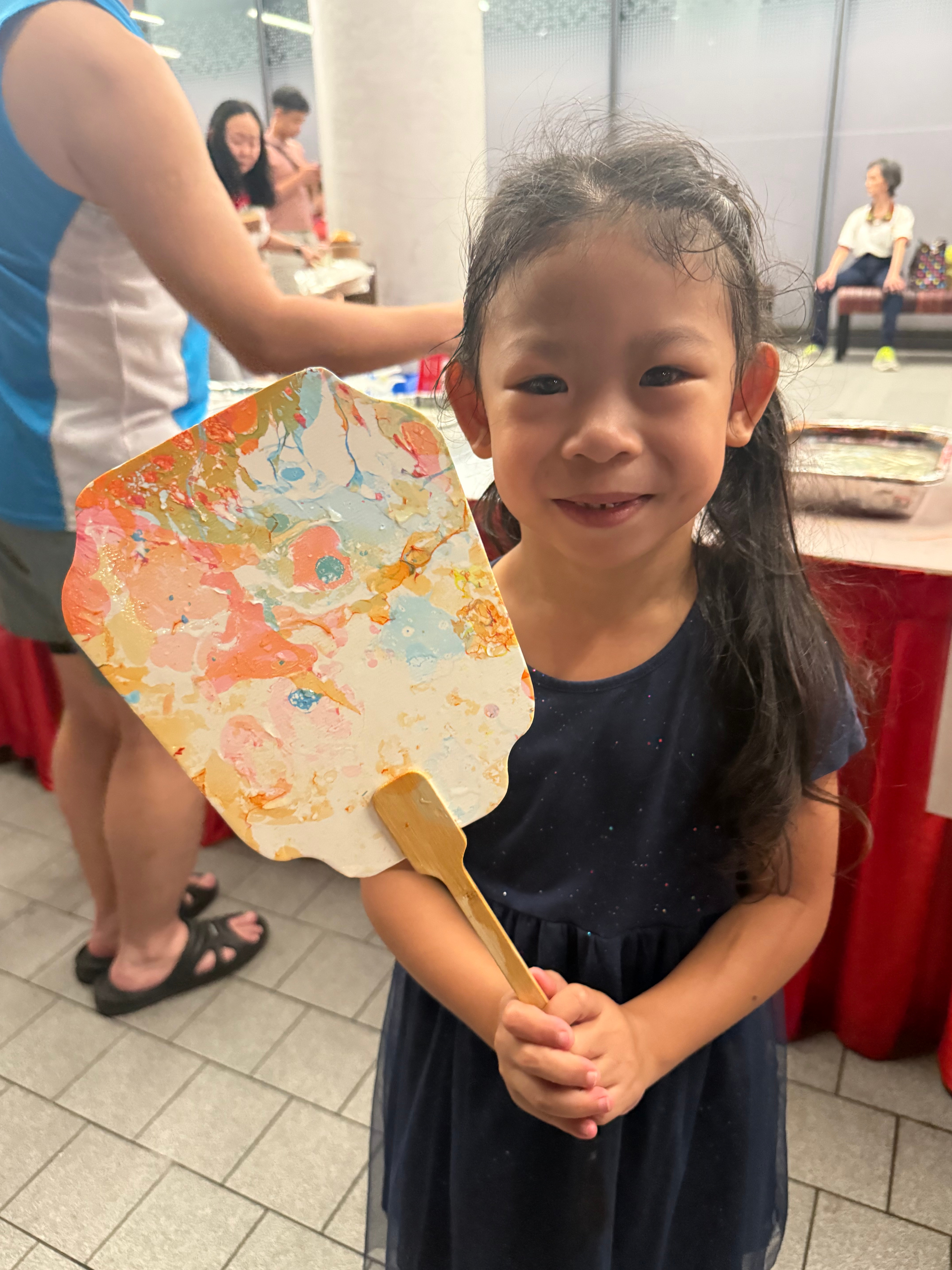 Marbling, a captivating technique that turns simple surfaces into flowing patterns of swirling colors, was presented to the participants. Each person created their own exquisitely marbled paper fans by experimenting with paint, water, and movement; each one was distinctive and striking.