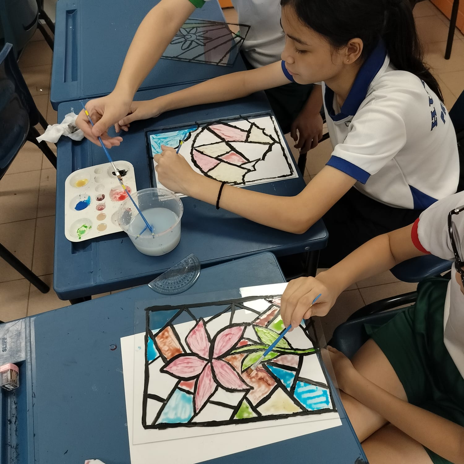 Students from Huamin Primary School experienced Stained Glass Art Painting for the first time in an exciting two-hour session. They were introduced to the basics of stained glass design, learning about bold outlines, colour separation, and careful paint application within defined sections.